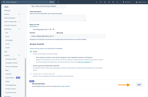 Pro tip: if you're using any schema generator outside of HubSpot, check your blog settings and make sure your structured data toggle is OFF. You don't want HubSpot's beta schema interfering with SuperSchema (which is honestly way higher quality, sorry HubSpot).